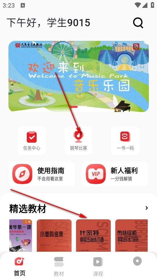 在首页我们能看到有钢琴比赛的资讯,宣传页以及平台精选学琴教材。