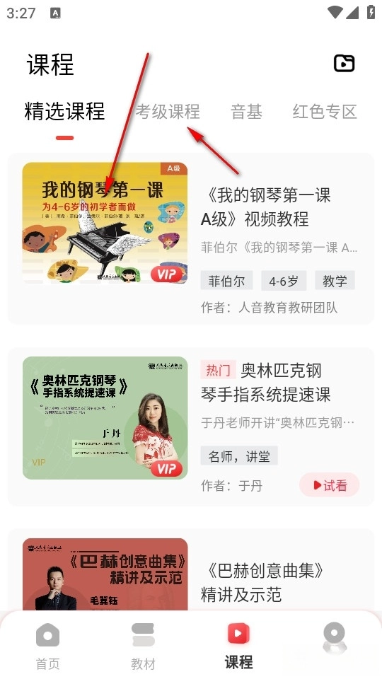 点击下方的课程即可跟着软件内的视频一起学习钢琴,考级用户也可以在课程界面当中找到考级课程。
