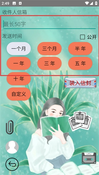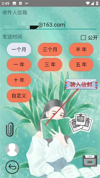 4、完成收件人与发送时间的设置后,点击“装入信封”按钮,即可将心情记录封装并按设置发送。