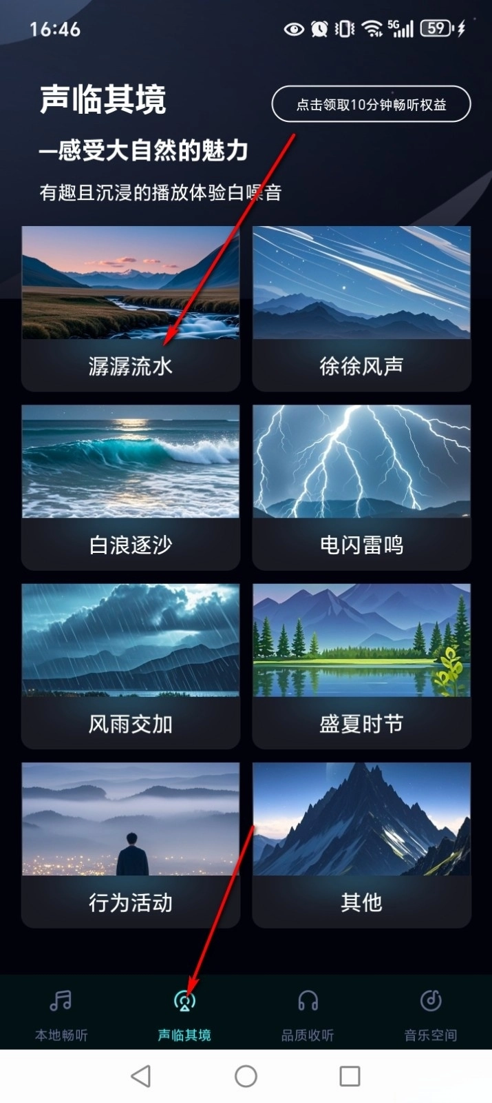 点击【身临其境】可以看到各种大自然的声音