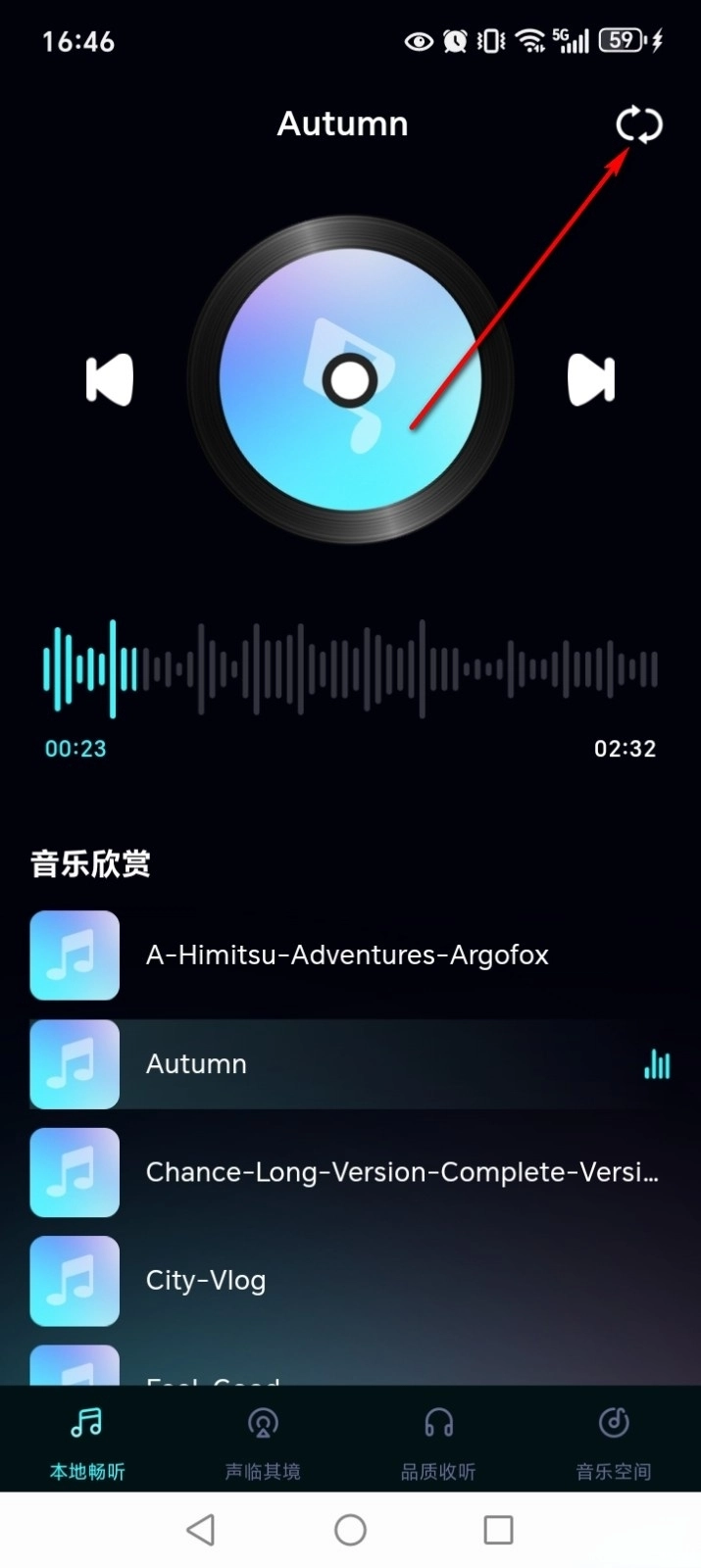 可以点击右上角如图按钮来切换列表循环、单曲循环和随机播放