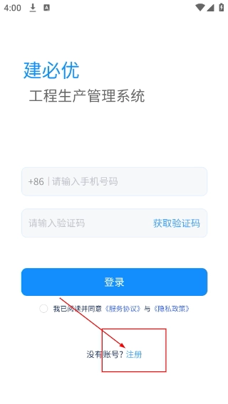 1、在【建必优-工程生产管理系统】登录页,可填写手机号、验证码登录,若无账号,点击【没有账号?注册】按钮进入注册流程。