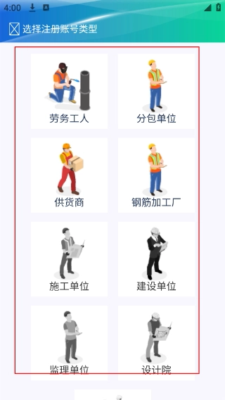 2、进入【选择注册账号类型】页,按需选择【劳务工人】-【分包单位】-【施工单位】等对应身份类型,确定注册账号的角色。