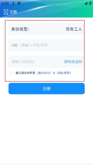 3、进入【注册】页,身份类型选定后,填写手机号、获取并输入验证码,勾选协议后点击【注册】按钮,完成账号注册操作。