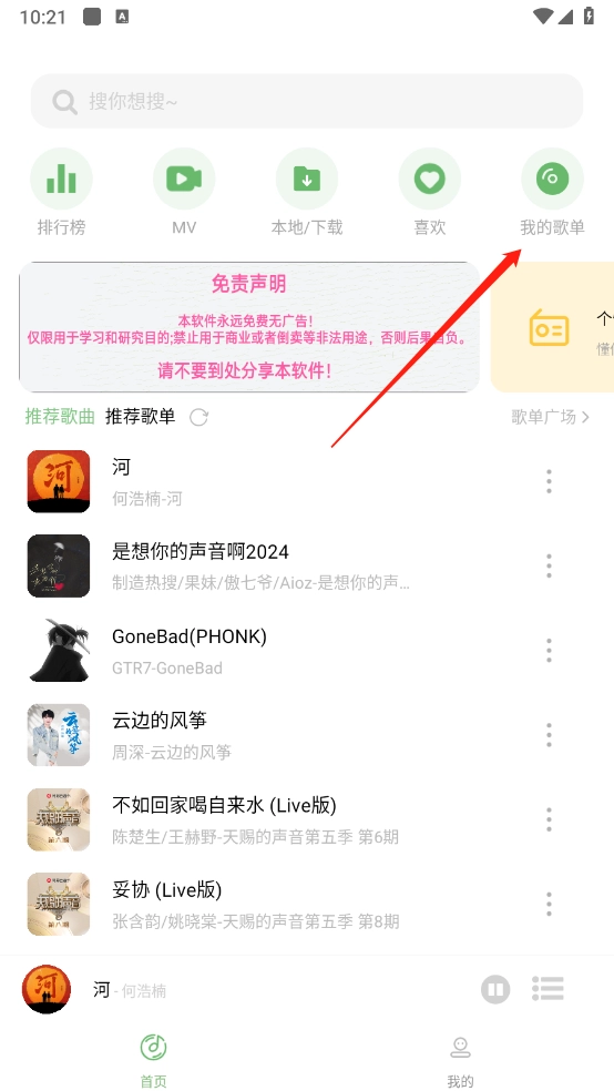 进入首页,点击右上角的“我的歌单”。