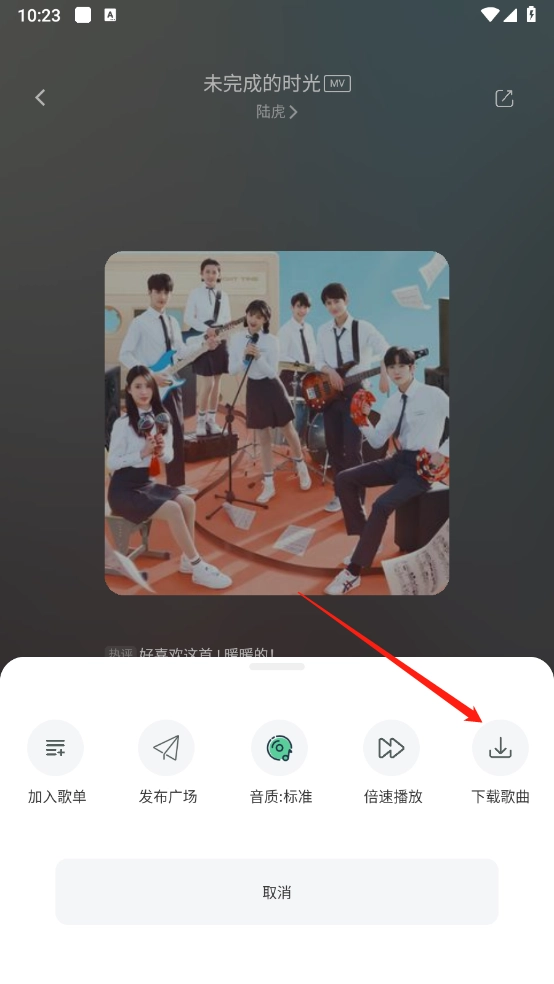 打开正在播放的歌曲点三个点也可以选择。