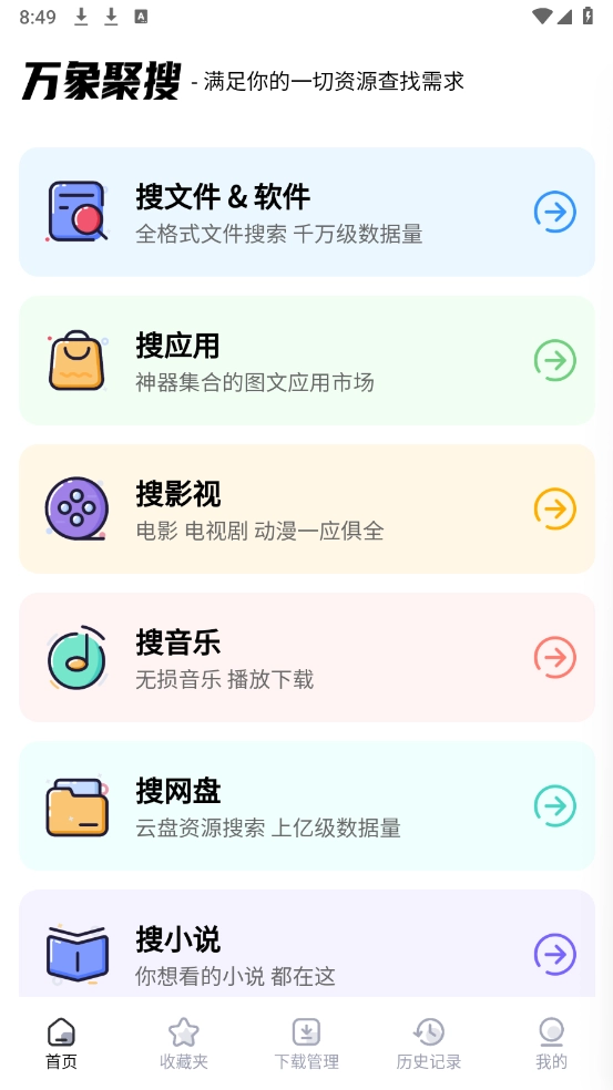 万象聚搜是一款超实用的搜索工具,只需一键操作,就能搜索网盘、影视、小说、漫画、音乐等各类资源。它不仅搜索速度快,内容也十分全面,还支持资源的收藏与分享功能。更重要的是,所有资源均免费提供,全程干扰,各类资源应有尽有,并且每天都在持续更新新资源,全方位满足你对资源查找的所有需求。