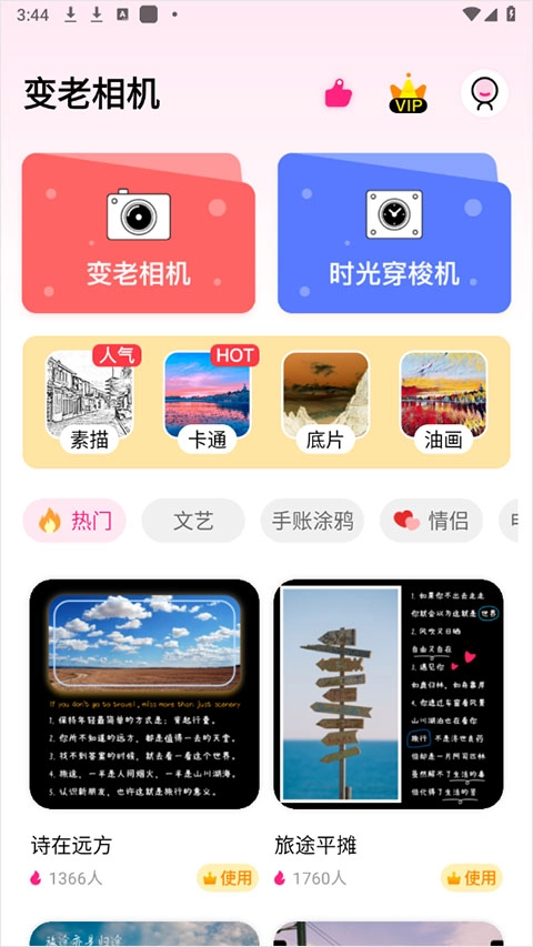 1、打开变老相机应用,进入主界面后,你会看到这里有各种各样的特效选项可以挑选。
