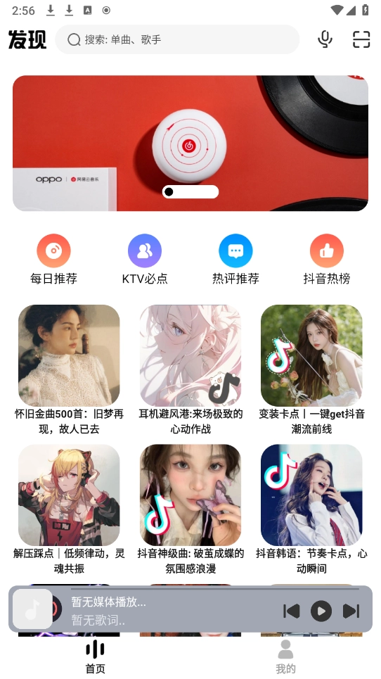首页汇聚了丰富多样的音乐类型,每日推荐、KTV必点以及抖音热歌等各类曲目一应俱全。