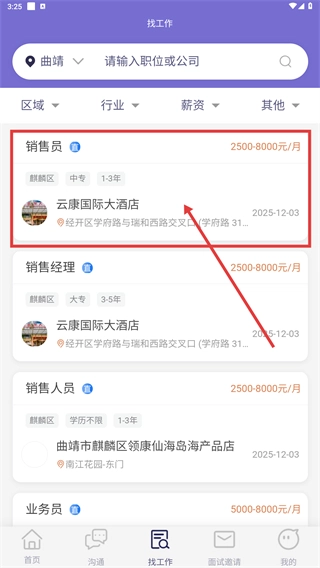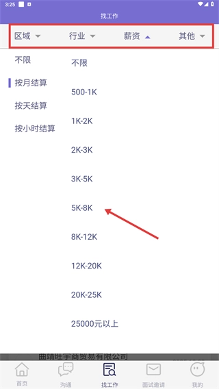 在“找工作”页面,借助“区域”“行业”“薪资”等筛选条件,能够精准锁定契合需求的岗位(例如选定“5K-8K”的薪资范围)。