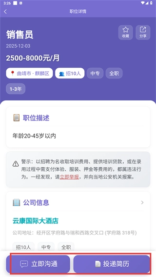 在职位详情页面,你可以点击【立即沟通】按钮和招聘方进行交流,也能点击【投递简历】按钮来完成岗位申请。