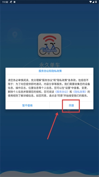打开应用后,仔细阅读《服务协议》与《隐私政策》,点击【同意】按钮,完成协议确认即可进入应用主界面。