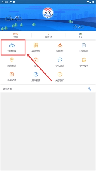 在主界面,点击【扫码租车】的功能入口,即可进入租车验证流程。