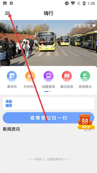 在“嗨行”首页点击左上角的菜单按钮,展开功能侧边栏后,就能看到切换城市、资料编辑等功能选项。