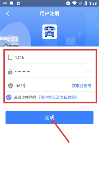 用户在注册页面依次填写手机号、密码和验证码,勾选《用户协议及隐私政策》,随后点击【完成】按钮,即可完成“嗨行”账号的注册流程。