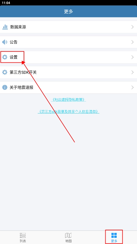 打开地震速报,在“更多”页面中点击“设置”;
