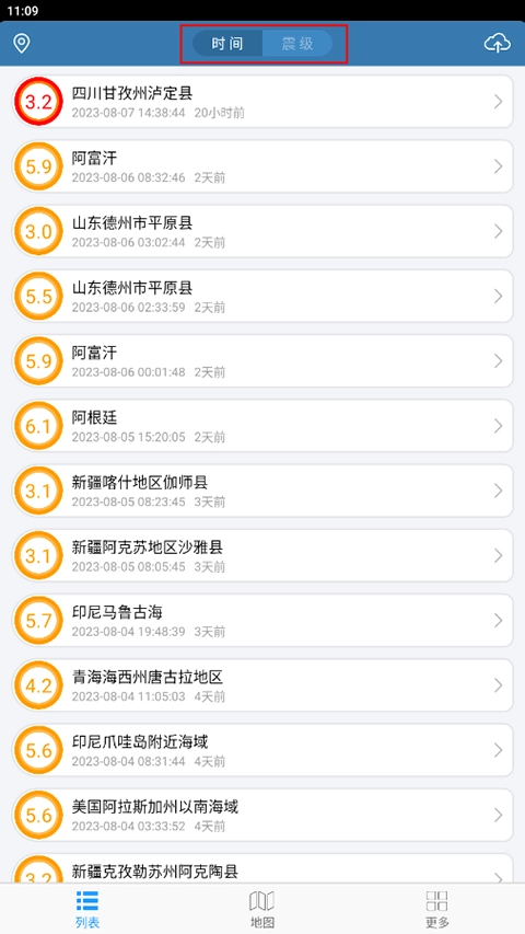 - 地震列表可按发震时间和震级大小排序。