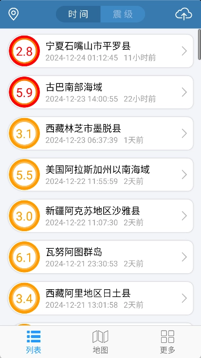 在“列表”页面里,我们能够依据时间与震级来查找自己感兴趣的地区。