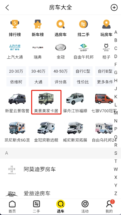 可以选择品牌和型号,也能依据价位区间进行筛选,这里以美景美家卡居为例。