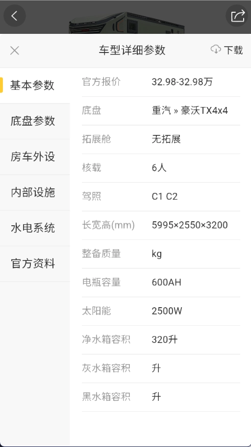点击参数配置,还能了解到底盘、长宽高参数,以及拓展仓和水箱的配置情况。