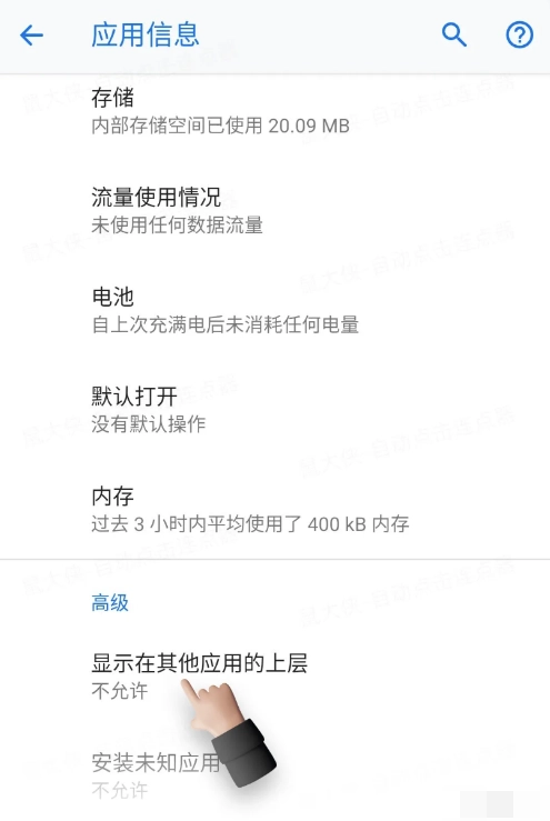 点击开启“允许显示在其他应用的上层”权限后的按钮;再点击该按钮。