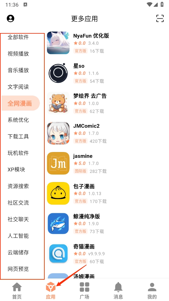 进入"应用"板块,根据分类进行选择,如图所示。