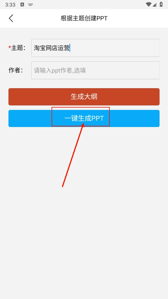 这里以“主题生成PPT”为例,点击进入后输入主题,如图所示,再点击“一键生成PPT”按钮。