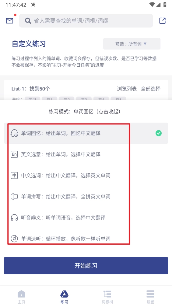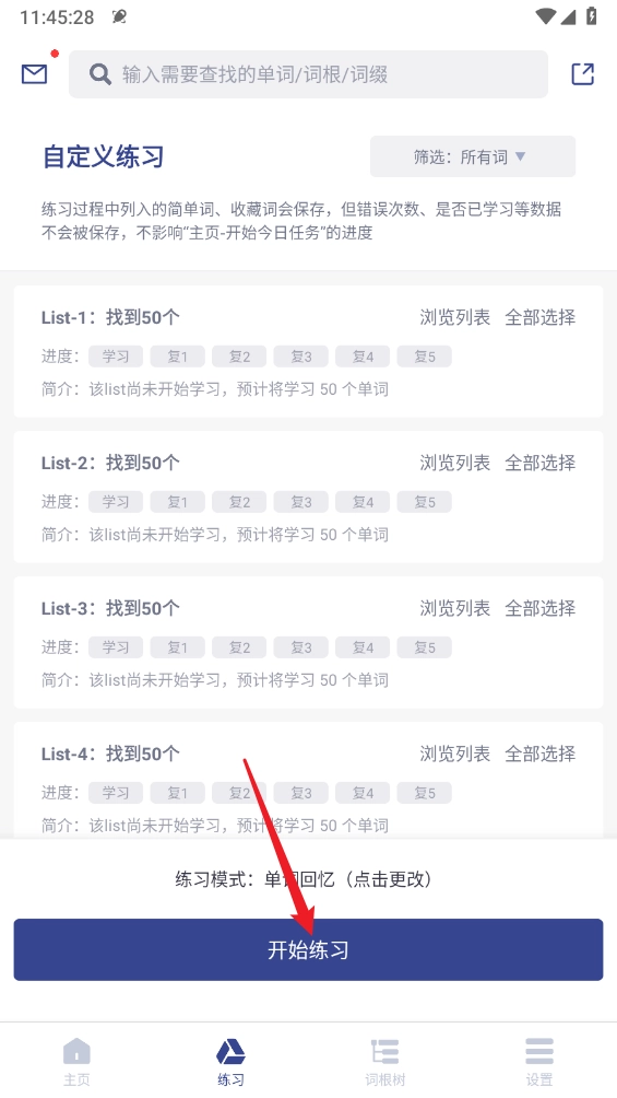 如图所示,选择所需单词,点击"开始练习"。