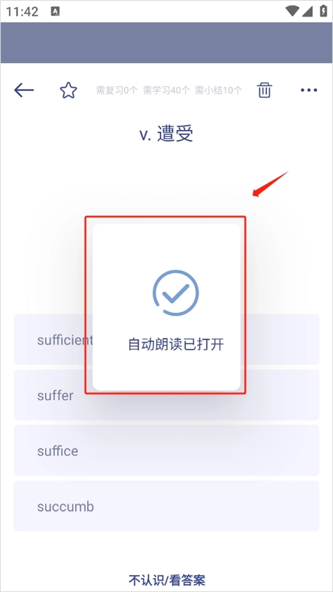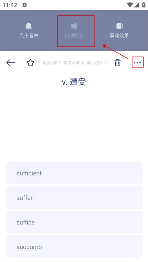 你可以先在这里任意选择一个练习模式,比如背单词,接着点击页面右上角的三个点图标,再选择“自动朗读”功能。