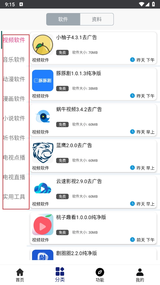 进入“分类”板块,这里有各类视频、小说、电视节目以及实时工具等内容可供你挑选。