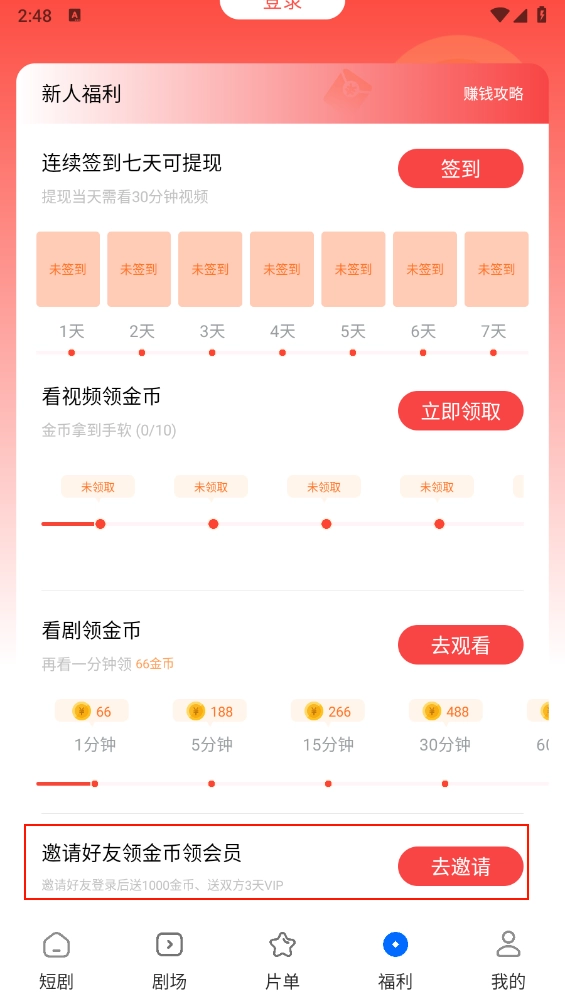 在“福利”页面,向下滑动找到“邀请好友领金币领会员”的入口,然后点击“去邀请”按钮。