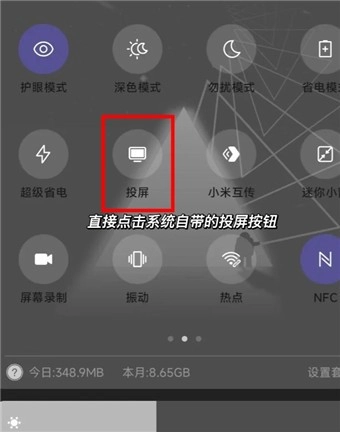 然后打开手机自带的屏幕镜像工具,就像下面图片里标红的位置那样。