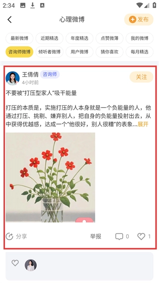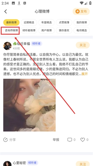 进入心理微博页面后,点击【咨询师微博】这个分类标签,就能筛选出咨询师发布的微博内容列表了。