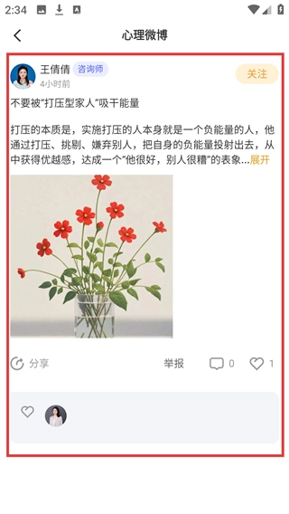 在咨询师微博列表中,找到微博,点击查看详情。