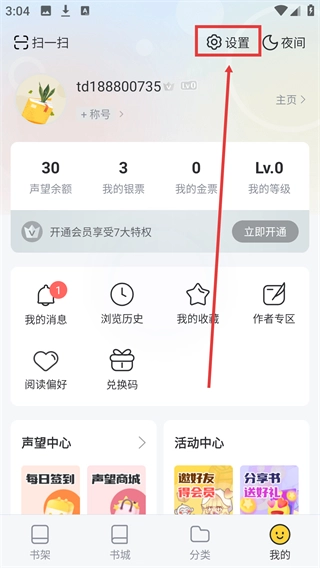 在书城页面点击底部的【我的】选项,就能进入个人功能页面,在这里可以进行账号相关的设置操作。