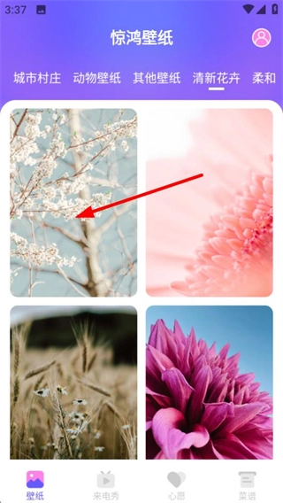 进入惊鸿壁纸应用后,点击“清新花卉”标签,即可切换至该风格的壁纸列表页面。