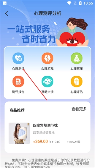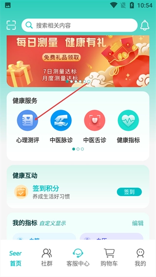 进入首页后,在健康服务板块点击【心理测评】功能。