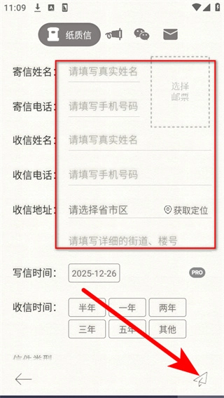 你只需依次完善寄信人和收信人的信息,再选择好收信时间,就能把这封信寄给指定的收信人了。