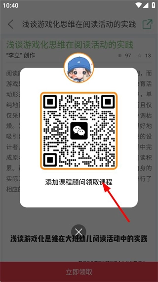 在教案详情页面点击“立即领取”按钮后,系统会弹出一个包含领取二维码的弹窗。