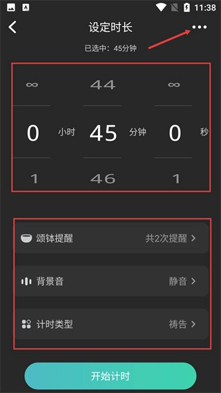 在【设定时长】页面点击右上角的三点图标,选择【倒数结束后停止计时】这个选项,确认配置无误后,点击底部的【开始计时】按钮就能启动计时了。