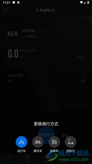 还能切换不同的骑行方式,包括自行车、摩托车、电瓶车和滑板车这四种选择。