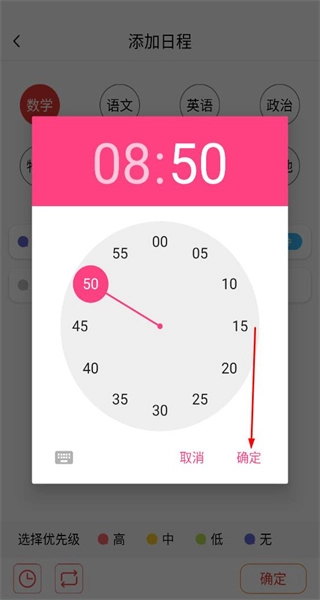 进入添加日程的页面后,第一步是选择对应的科目,之后填写日程的标题,再点击选择时间的按钮。