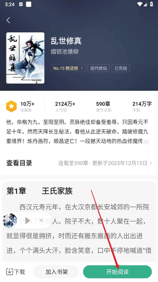 在小说阅读详情页,点击"开始阅读"
