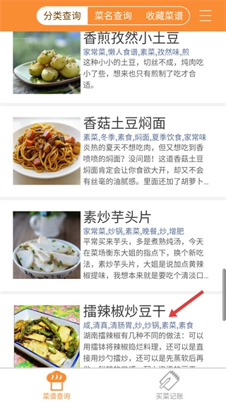 在分类查询页面点击【素菜】标签,就能切换到素菜类菜谱列表,进而查看该分类下的相关菜品信息。