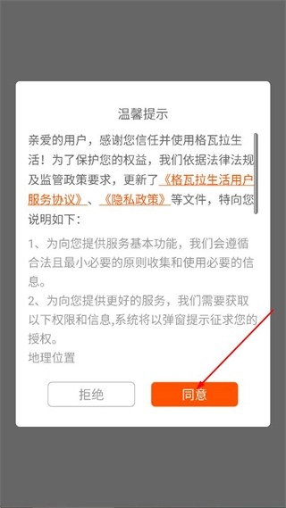在格拉瓦生活的温馨提示弹窗里,点击同意按钮,就能进入推荐页面啦。