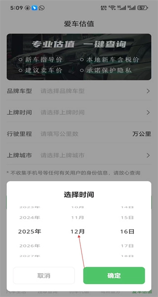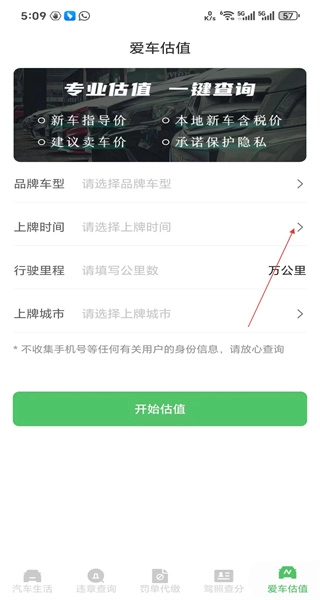 进入爱车估值页面,浏览估值相关选项,定位到上牌时间区域,点击该区域打开时间选择界面。