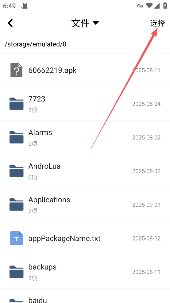 然后点击右上角的【选择】选中你需要压缩的文件