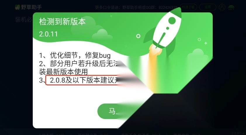 野草助手2.08TV版安装包是专门适配小米、海信等品牌电视的版本,不过它属于旧版本,目前已有更高版本推出。因此部分机型使用时可能会弹出提示,建议野草助手2.08及以下版本的用户进行升级。如果遇到无法使用的情况,还是推荐大家升级到野草助手TV版的最新安装包再使用。这款工具除了能帮我们远程安装电视应用外,还具备清理和管理电视软件的功能,实用性很强。