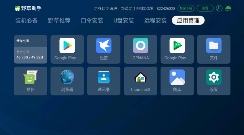 可以利用野草助手把应用转移到U盘,之后借助电视自身的U盘安装功能来完成安装。