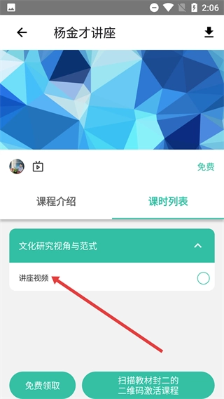 在讲座详情页面,点击【免费领取】按钮来获取课程权限,之后在【课时列表】里选择“讲座视频”这一课时。